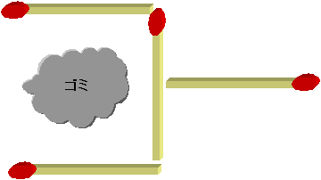 (問題) マッチで作ったチリトリにゴミが入っています。 マッチ2本動かしてチリトリからゴミを出して下さい。 (ゴミは動かしません)